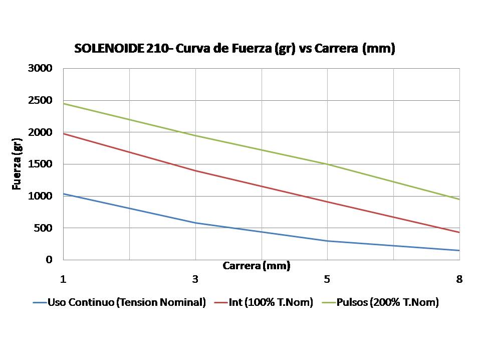 - Fuerza de Tiro: Ver tabla de valores. Intiutivamente se deduce que a menor distancia recorrida del nucleo móvil respecto del cuerpo, mayor será la atracción electromagnética y por ende mayor la fuerza de tiro. Se puede aumentar la fuerza de tiro energizando el solenoide a mayor voltaje, siempre cuidando la elevación de temperatura.